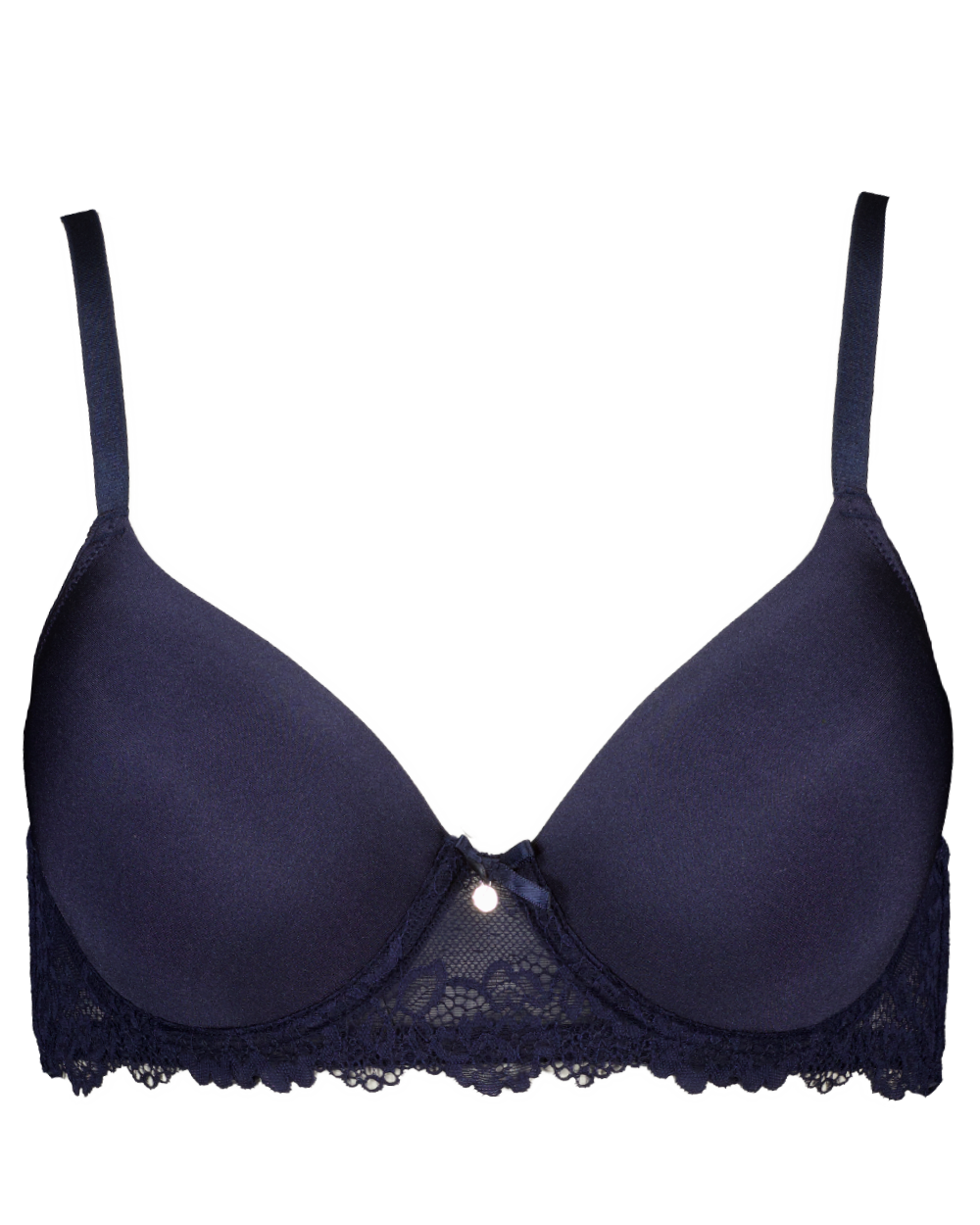 Deze blauwe gewatteerde bh voor dames is gemaakt van kant en heeft een normale onderborst. De stof bestaat uit polyamide en elastaan, wat zorgt voor een comfortabele pasvorm en voldoende steun. De bh is geschikt om dagelijks te dragen.