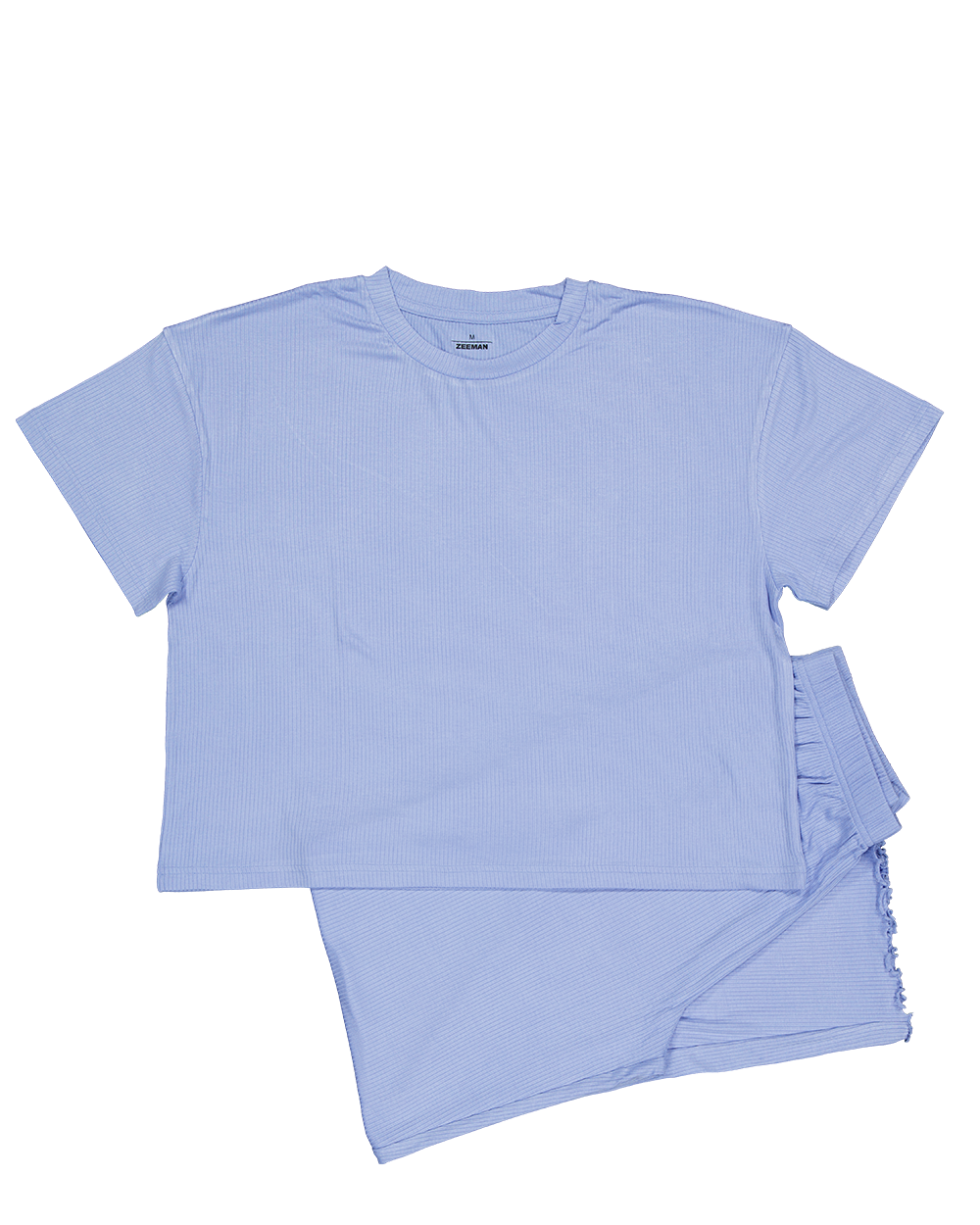 Deze damespyjama bestaat uit een T-shirt met korte mouwen en een lange broek met wijde pijpen. De ribstructuur van de stof zorgt voor een lichte rek en een soepele pasvorm. Door de combinatie van viscose en elastaan voelt de pyjama zacht aan. Dit maakt de pyjama comfortabel om in te slapen of om thuis te ontspannen.