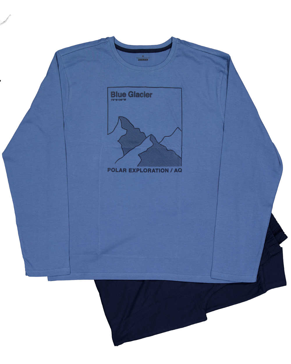 Deze herenpyjama bestaat uit een lange broek en een shirt met lange mouwen. De top heeft een ronde hals en is gemaakt van zachte single jersey katoen. Het shirt is blauw met een print, de broek is donkerblauw. De stof voelt comfortabel aan en draagt prettig.