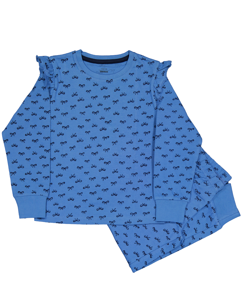 Deze blauwe meisjespyjama is gemaakt van een zachte single jersey stof met 95% katoen en 5% elastaan. De pyjama heeft een ronde hals, lange mouwen en lange broekspijpen. Op de stof is een subtiel all-over patroon zichtbaar. De schouders zijn afgewerkt met een kleine ruffle. Dankzij de comfortabele stof en pasvorm is deze pyjama geschikt om fijn in te slapen.