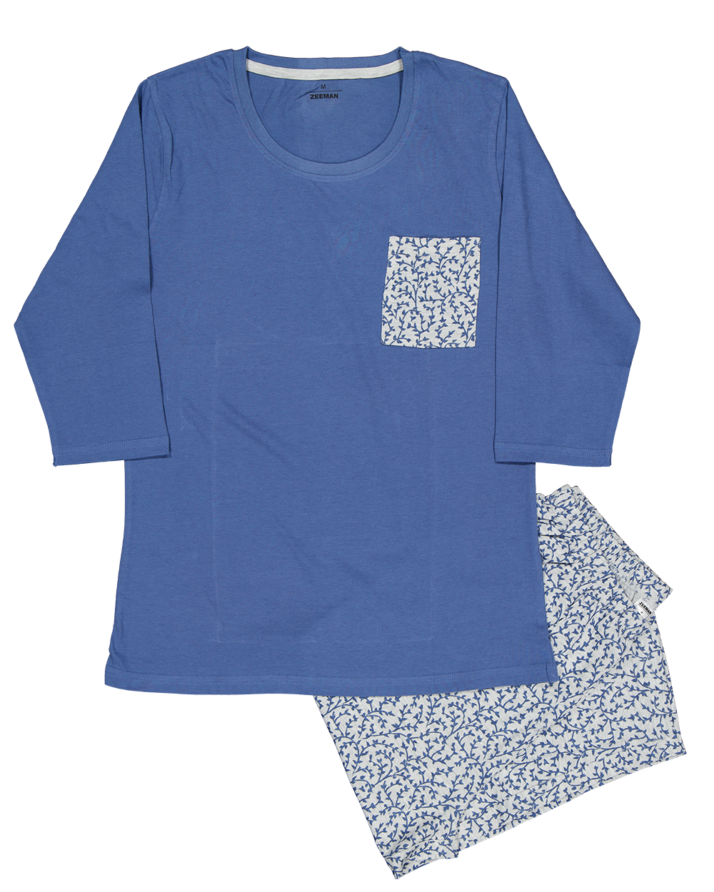 Deze pyjama voor dames bestaat uit een blauw shirt met een ronde hals en een zakje met een patroon. Het materiaal is single jersey van 100% katoen, wat zorgt voor een zachte en ademende stof. De mouwen en broekspijpen zijn lang.