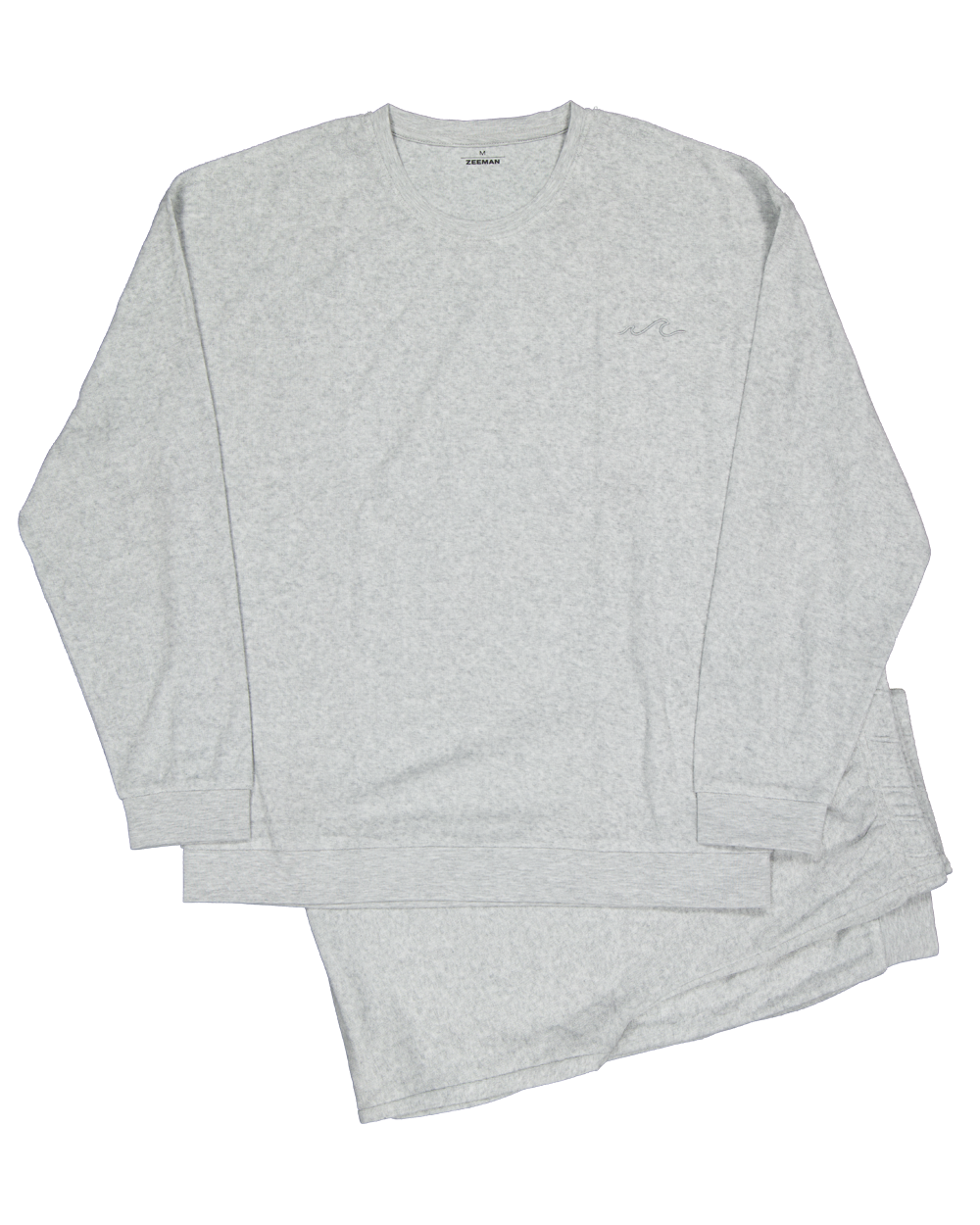 Deze herenpyjama is gemaakt van zachte badstof, bestaande uit 80% katoen en 20% polyester. De set heeft een trui met lange mouwen en een ronde hals. De stof voelt prettig aan en houdt goed warm tijdens koelere nachten. Door het effen ontwerp oogt de pyjama rustig. Geschikt om comfortabel te dragen in huis.