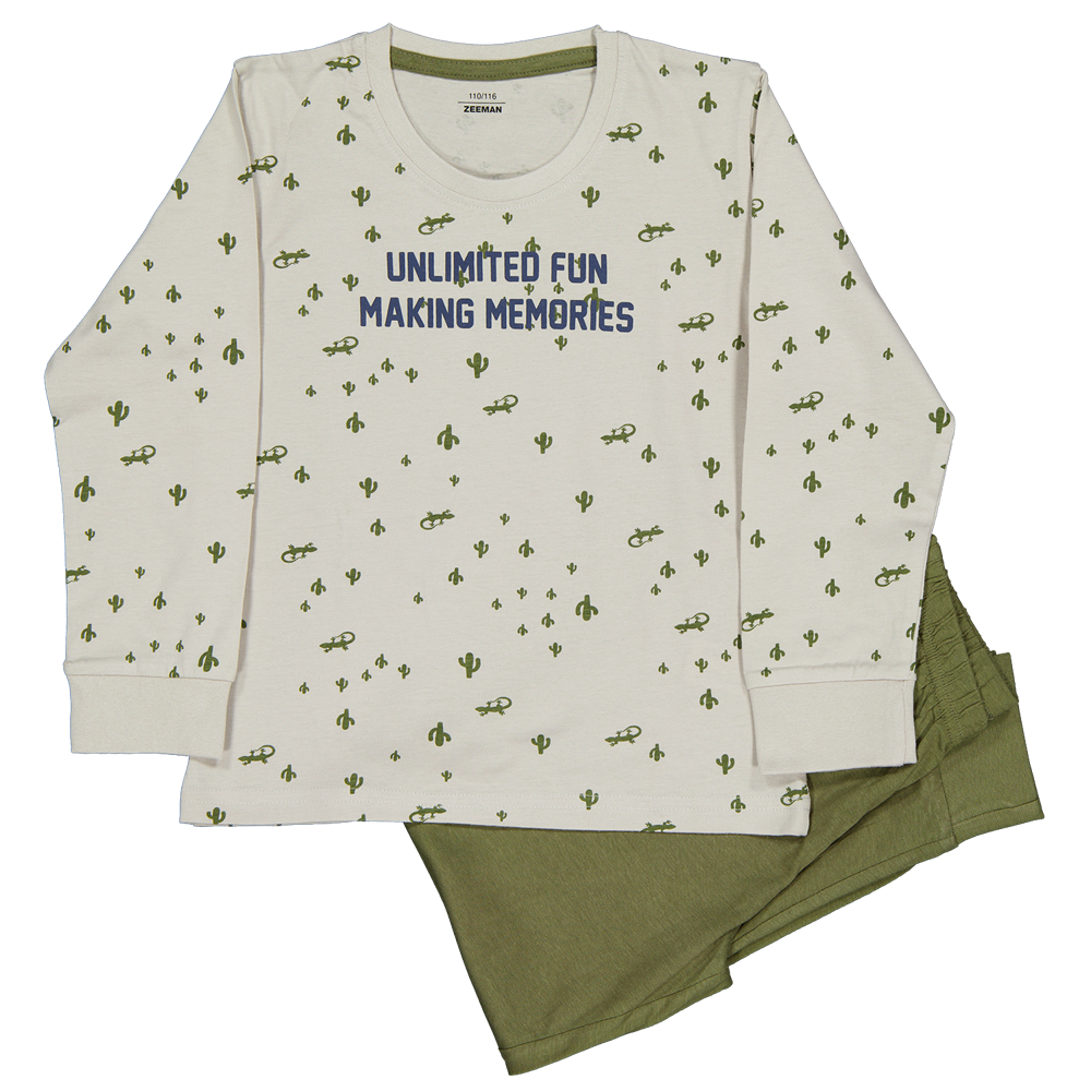 Deze pyjama is gemaakt van 100% katoen single jersey. Dit zorgt voor een zachte, ademende stof die prettig aanvoelt op de huid. Het shirt heeft lange mouwen en een vrolijke all-over print met kleine groene figuren. De effen groene broek zit comfortabel door de elastische tailleband.