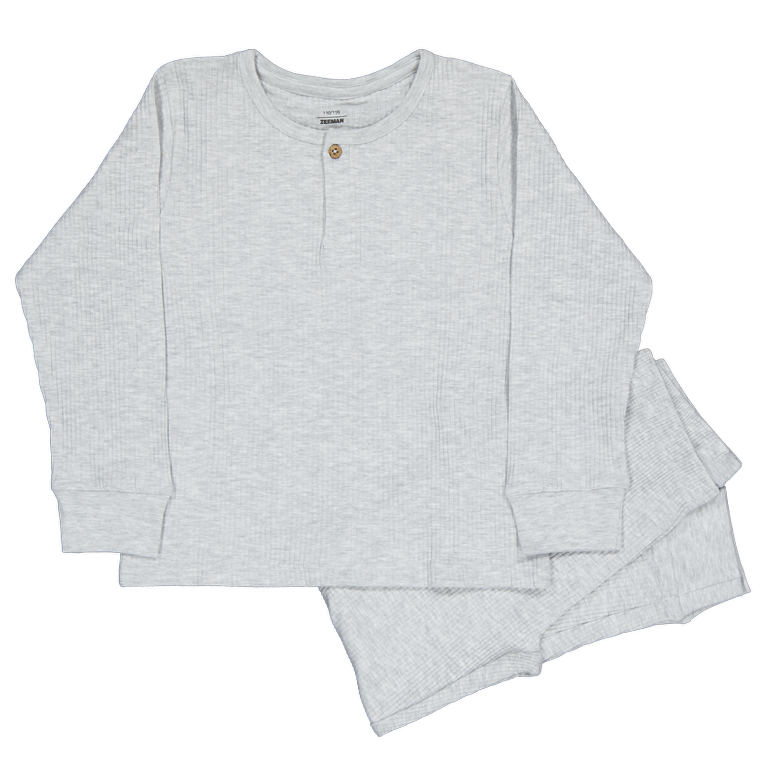 Deze grijze pyjama voor jongens is gemaakt van een zachte ribstof met katoen, elastaan en polyester. De top heeft lange mouwen en een ronde hals met een knoopje, waardoor je de pyjama makkelijk aan- en uittrekt. De soepele stof zorgt voor een comfortabele pasvorm, zodat jongens prettig kunnen slapen en zich vrij kunnen bewegen tijdens de nacht.