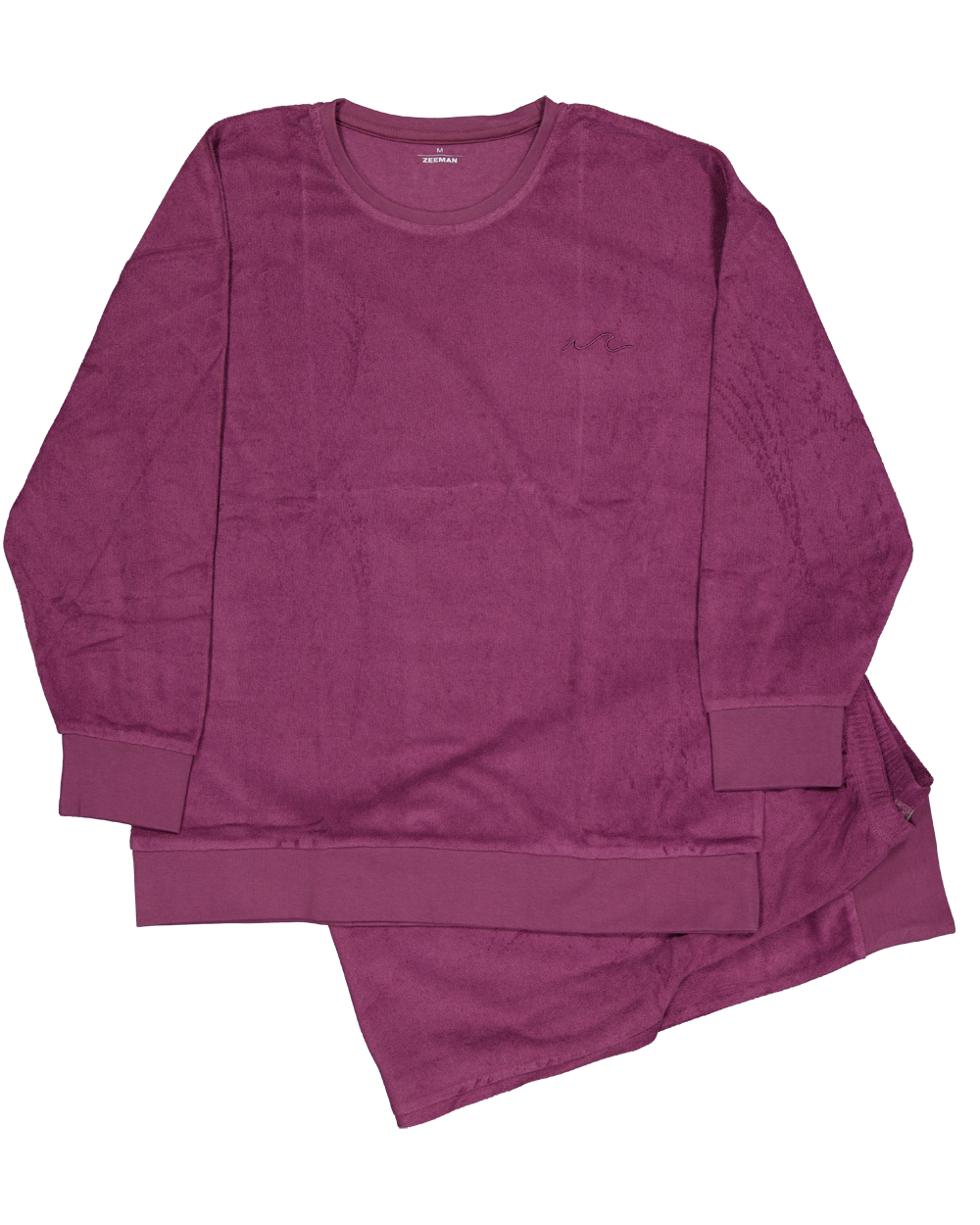 Deze damespyjama is gemaakt van zachte badstof en bestaat uit 80% katoen en 20% polyester. De set heeft een trui met lange mouwen en een bijpassende broek, beide in een effen paarse kleur. Afgewerkt met een brede boord bij de hals, mouwen en onderkant. De stof voelt comfortabel aan en houdt je goed warm.