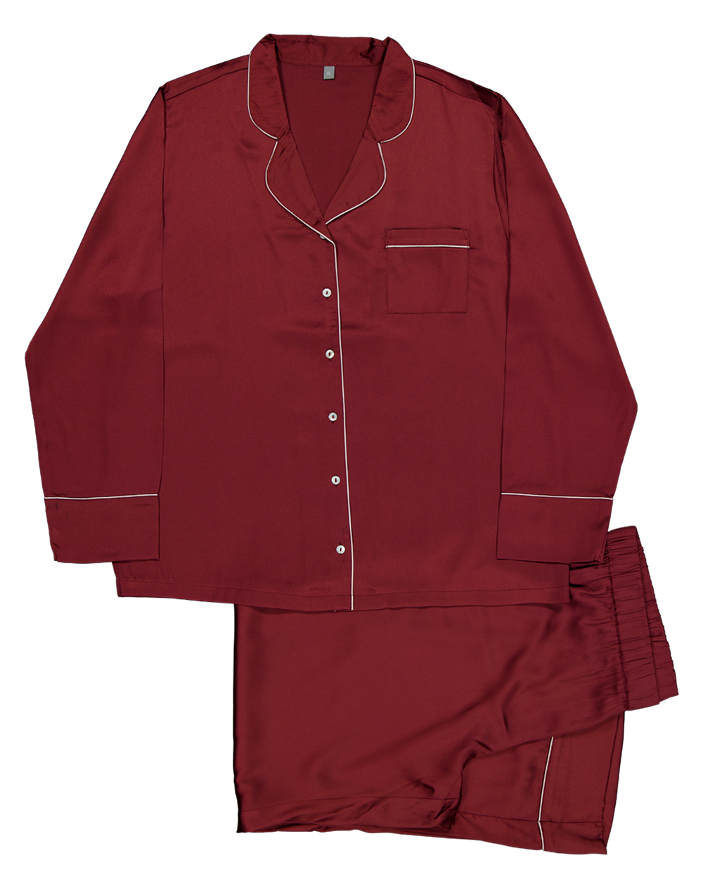 Deze bordeauxrode damespyjama heeft een top met lange mouwen en een lange broek met elastische taille. De stof voelt zacht en glad aan op de huid. De pyjama sluit met knoopjes aan de voorkant en heeft een handig borstzakje. Door het lichte materiaal zit deze pyjama comfortabel, zodat je prettig kunt ontspannen of slapen.