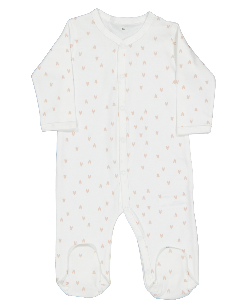 Deze roze unisex pyjama voor pasgeborenen is gemaakt van 100% katoen en heeft een voetjesmodel. De stof is wit met een patroon van kleine gekleurde stipjes. De pyjama heeft lange mouwen en sluit aan de voorkant met drukknoopjes die doorlopen tot aan de voetjes. Dankzij het zachte katoen en de praktische sluiting is aankleden eenvoudig en comfortabel voor je baby.