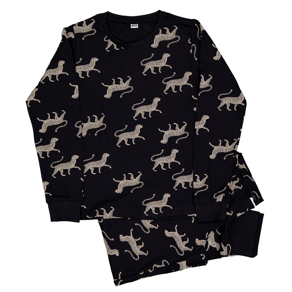 Deze pyjama voor tieners is gemaakt van een comfortabele stofmix met 98% katoen en 2% elastaan, wat zorgt voor een fijne pasvorm. Het zwarte design heeft een all-over print met dieren, wat het een speelse uitstraling geeft. De lange mouwen en de ronde hals bieden extra gemak.
