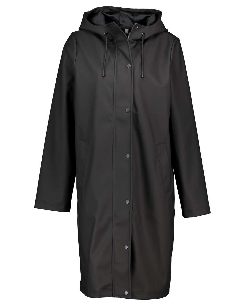 Deze zwarte damesregenjas is gemaakt van 100% polyurethaan. De jas is lang en heeft lange mouwen. De capuchon is voorzien van een aantrekkoord, handig bij regen en wind. De jas sluit met drukknopen aan de voorkant. Het gladde materiaal maak je makkelijk schoon. Een praktische jas voor de regenachtige dagen.