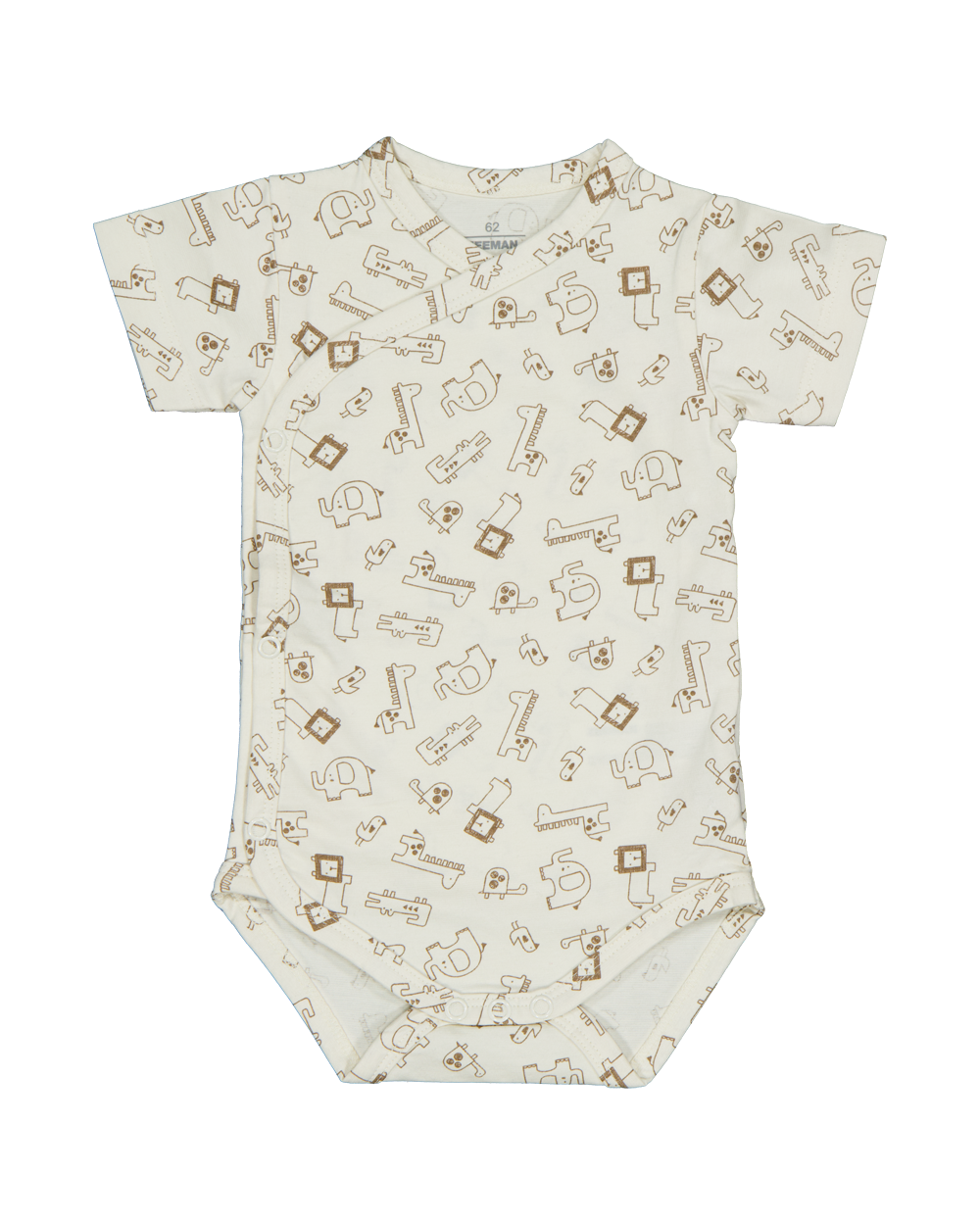 Deze beige romper voor baby is gemaakt van 97% katoen en 3% elastaan. De romper heeft korte mouwen en een vrolijke print in bruin en beige tinten. Door de zachte en licht elastische stof zit de romper comfortabel en kan je baby zich makkelijk bewegen. Ideaal om te dragen tijdens het spelen of slapen.