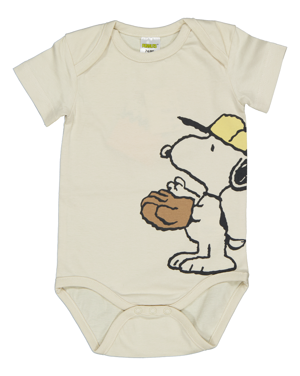 Deze beige romper voor baby's is gemaakt van single jersey en heeft korte mouwen. Op de voorkant staat Snoopy met honkbalhandschoen. De romper heeft een ronde hals en is praktisch in gebruik door de soepele stof. Ideaal voor comfortabel dragen op warme dagen en makkelijk aan en uit te trekken.