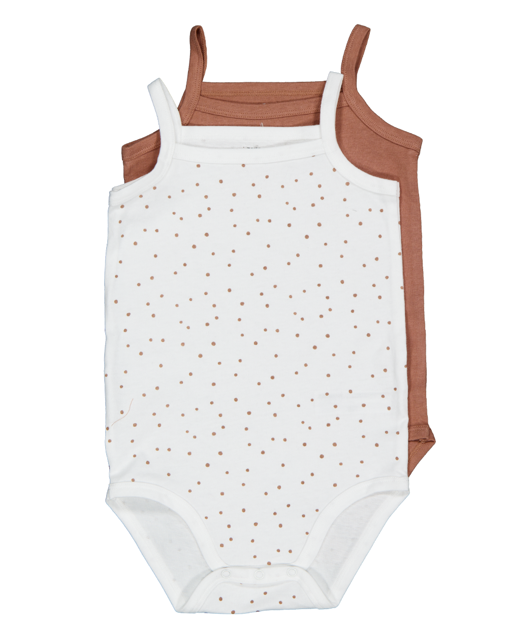 Deze set bevat twee babyrompers met smalle schouderbandjes. Eén romper is effen bruin, de andere is wit met een subtiel stippenpatroon. Beide rompers zijn gemaakt van 100% katoen, wat zacht aanvoelt en prettig is voor de gevoelige babyhuid. Door het mouwloze model zijn ze geschikt voor warmere dagen of als laagje onder andere kleding.