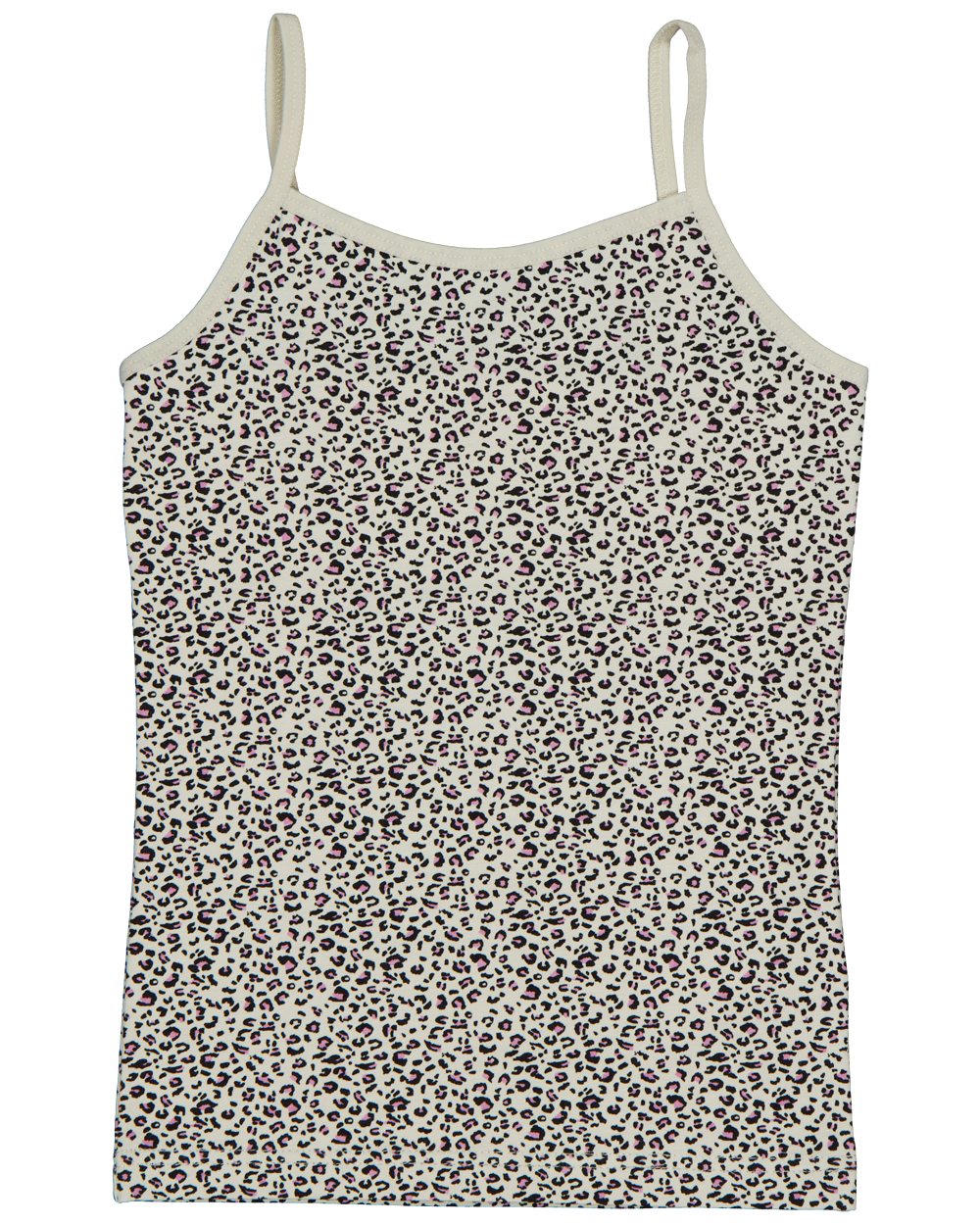 Deze meisjes singlet heeft een beige ondergrond met een all-over print van kleine zwarte en bruine vlekjes. De singlet is gemaakt van een zachte mix van katoen, polyester en elastaan, wat zorgt voor een comfortabele en soepele pasvorm. Dankzij de smalle schouderbandjes en de lichte stof is deze singlet prettig te dragen op warme dagen of als extra laagje onder kleding.