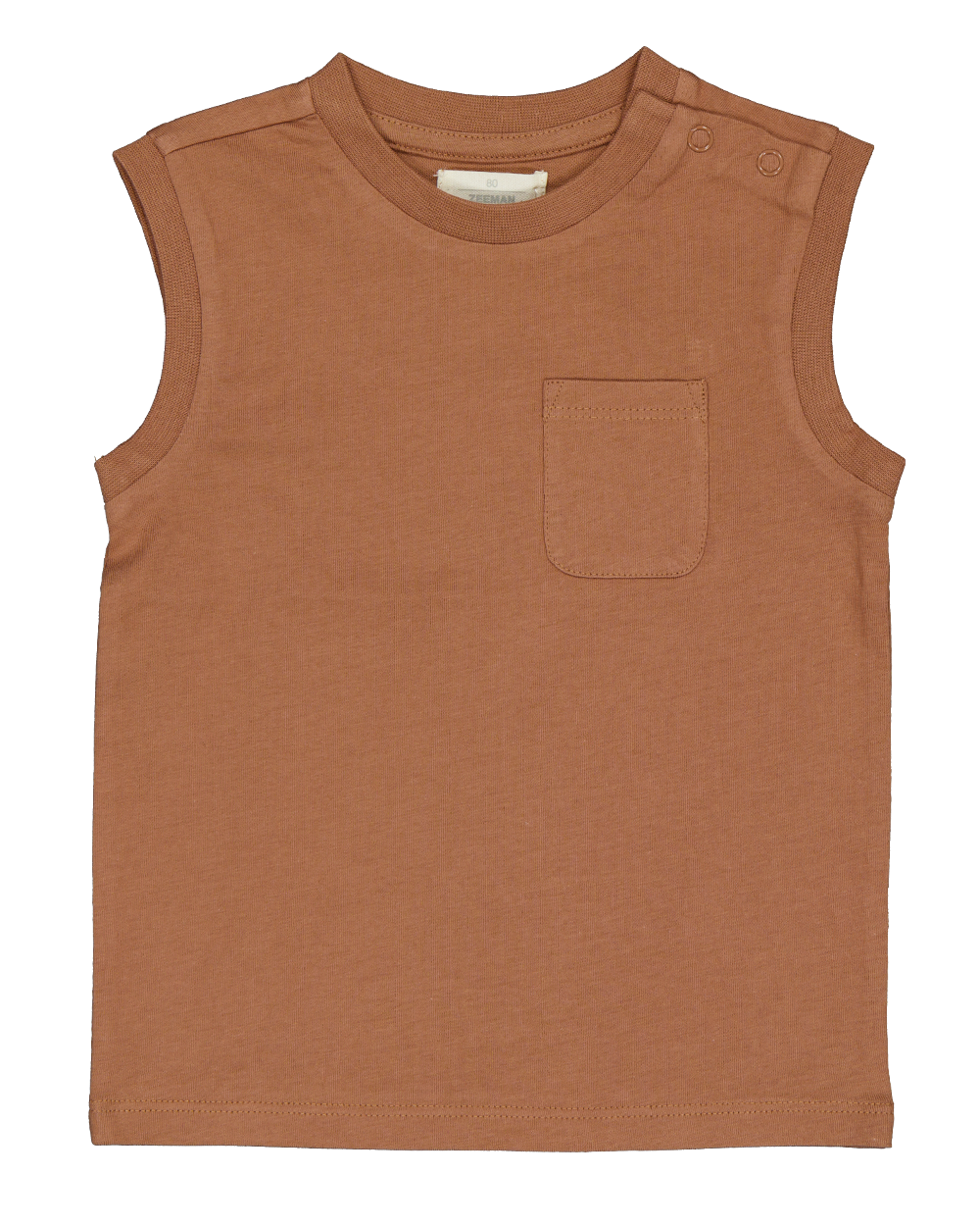Deze bruine singlet voor baby's heeft een klein borstzakje en drukknoopsluiting bij de schouder. De singlet is gemaakt van 100% katoen, wat zacht aanvoelt op de huid. Door het materiaal is hij geschikt voor warme dagen en draagt hij comfortabel.