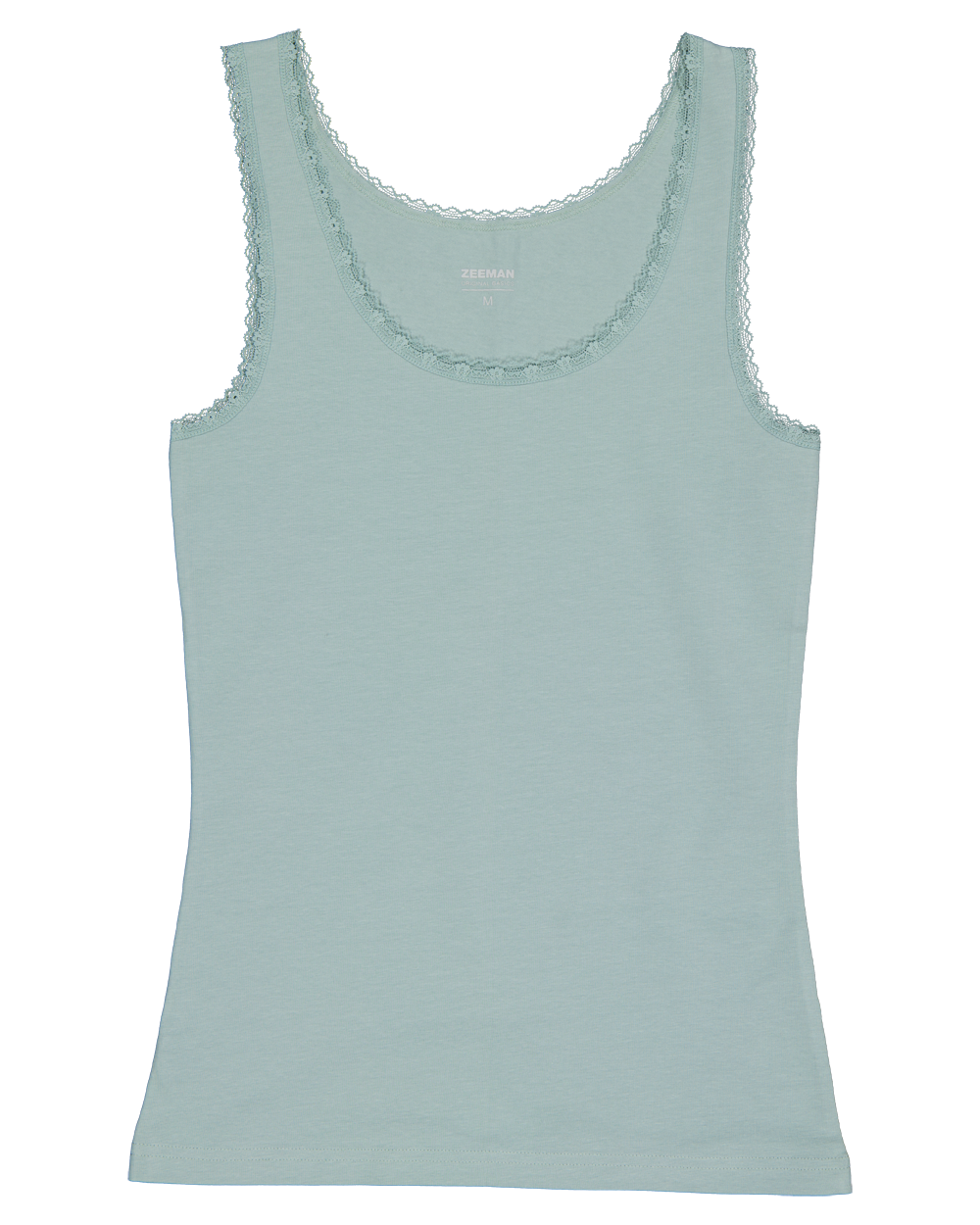 Deze dames singlet heeft een effen groene kleur en is gemaakt van een soepele single jersey stof. De samenstelling bestaat uit 95% katoen en 5% elastaan, wat zorgt voor een comfortabele pasvorm en wat extra stretch. De halslijn en armsgaten zijn netjes afgewerkt met een subtiel randje. Geschikt om los te dragen of onder een vest of trui.