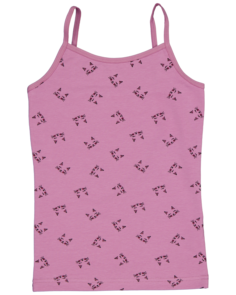 Deze paarse singlet voor meisjes is gemaakt van een zachte mix van katoen, polyester en elastaan. De stof voelt comfortabel aan en biedt voldoende stretch voor extra draaggemak. De dunne schouderbandjes en rechte hals zorgen voor een luchtig model. Op de stof staan kleine, speelse kattenkopjes afgebeeld. Ideaal als onderlaag of gewoon zo op warme dagen.
