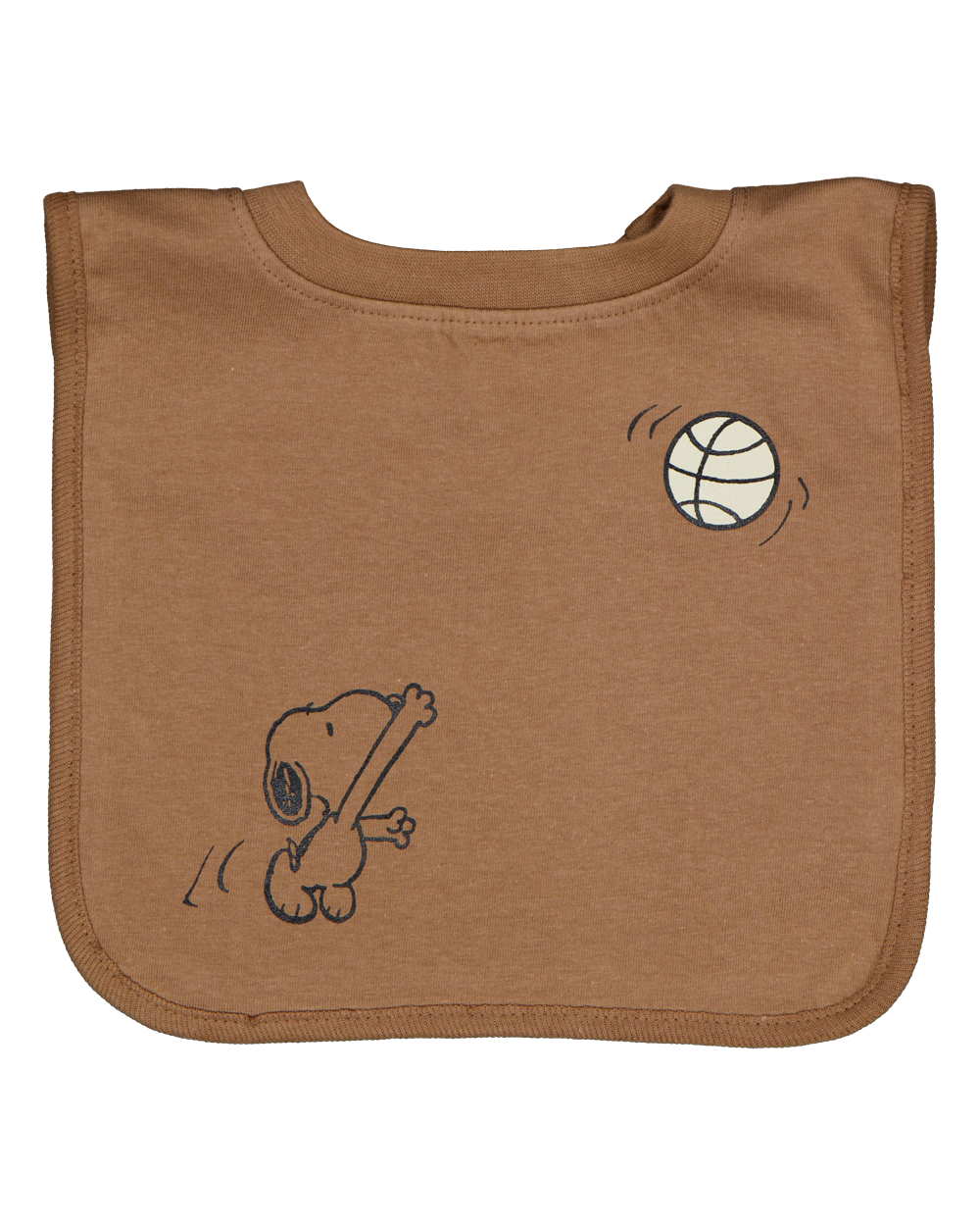 Deze slab voor baby's in de kleur bruin is gemaakt van single jersey. Op de voorkant staat een tekening van een hondje dat naar een bal springt. De slab heeft een rechte vorm en een ronde hals, waardoor je hem eenvoudig omdoet tijdens het eten.