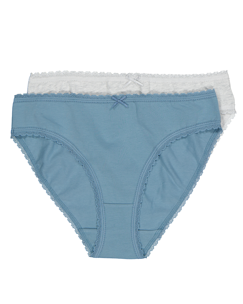 Deze set bestaat uit twee damesslips: één in het blauw en één in een lichte, gemêleerde tint. Beide slips zijn voorzien van een klein strikje aan de voorkant en hebben een smalle kanten afwerking langs de randen. De zachte stof en de aansluitende pasvorm zorgen voor optimaal draagcomfort.