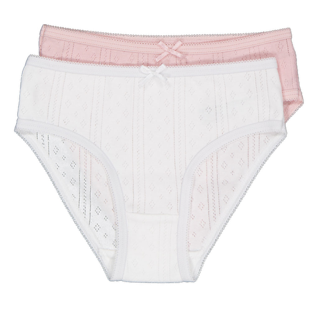Deze witte meisjesslip is gemaakt van 100% katoen, wat zorgt voor comfort en een goede ademing. De slip heeft een eenvoudig patroon en een schattig strikje als subtiel detail. Je ontvangt twee slips in deze set, ideaal om mee af te wisselen.