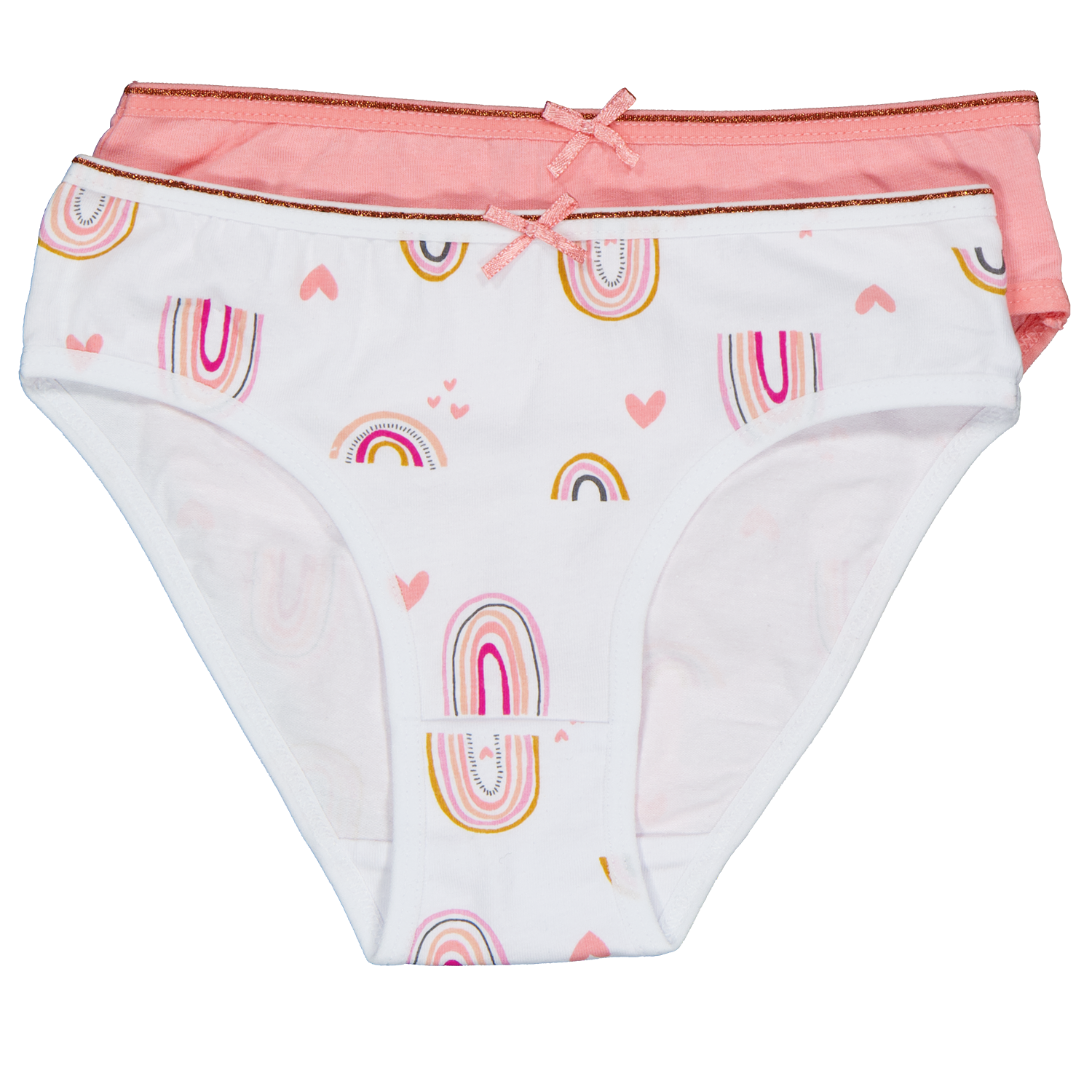 Set van 2 slips voor meisjes. Eén slip is wit met een vrolijke regenboogprint, de andere is effen roze. Beide slips hebben een comfortabele, elastische tailleband met een klein strikje. Door de combinatie van katoen en elastaan zijn de slips zacht en licht rekbaar. Ze sluiten prettig aan en zijn makkelijk aan en uit te trekken.