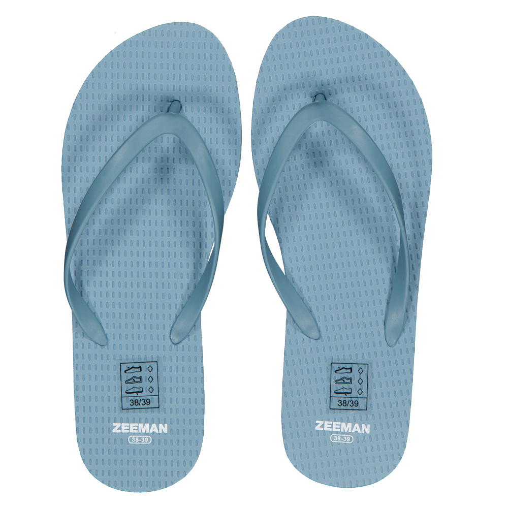 Deze blauwe slippers voor dames zijn gemaakt van polyester en hebben smalle bandjes van polyvinylchloride. Door de stevige bandjes blijven ze goed om de voet zitten. Het lichte materiaal zorgt voor draagcomfort, zowel thuis als op het strand. De zool met eenvoudig profiel geeft extra grip op gladde ondergronden. Praktisch voor warme dagen en makkelijk in gebruik.