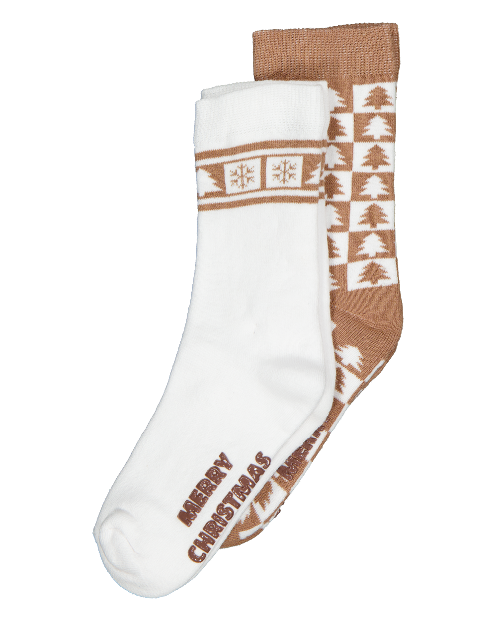 Deze set van twee paar sokken voor jongens en meisjes bestaat uit een beige en een witte variant. De ene sok heeft een dessin met kerstbomen en blokken, terwijl de andere sok een sneeuwvlokmotief en de tekst 'Fijne kerst' op de voet heeft. De sokken zijn geschikt voor de feestdagen en zorgen voor warme voeten tijdens koude dagen.