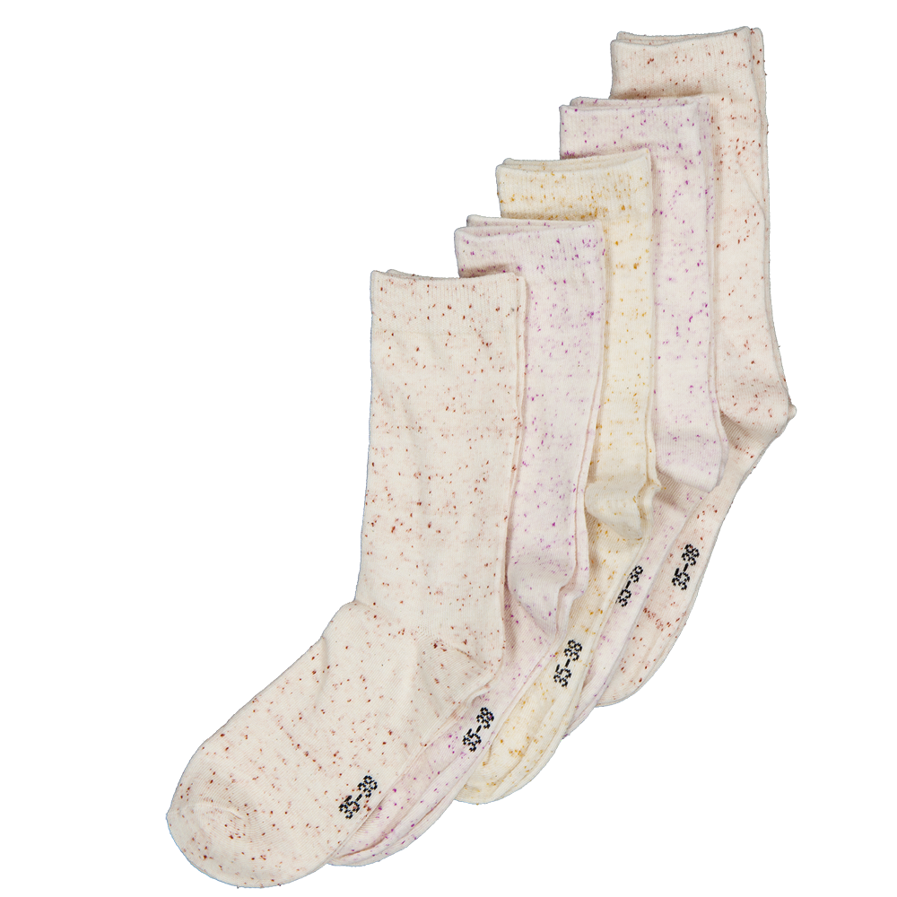 Deze set bestaat uit vijf paar sokken voor dames, uitgevoerd in lichte kleuren met kleine spikkels. De sokken zijn gemaakt van een zachte stof en hebben een comfortabele pasvorm. Door de neutrale tinten passen ze goed bij verschillende dagelijkse outfits. Handig om te wisselen en eenvoudig te combineren, waardoor je altijd passende sokken hebt voor elke dag.