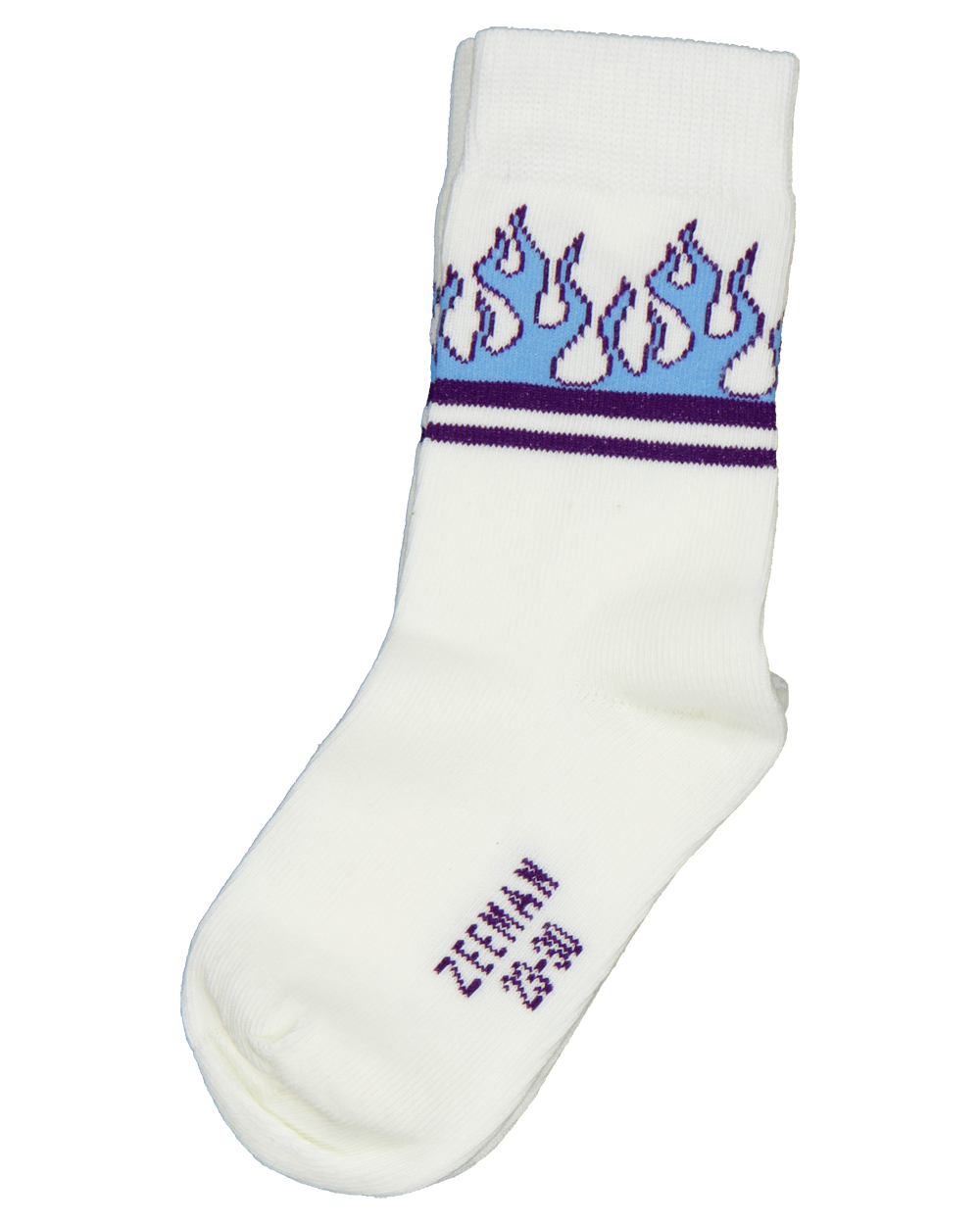 Deze witte kindersokken zijn versierd met een patroon van blauwe vlammen en paarse lijnen aan de bovenkant. Ze bestaan uit 72% katoen, 26% polyamide en 2% elastaan, wat zorgt voor optimaal draagcomfort en een perfecte pasvorm. Ideaal voor dagelijks gebruik.