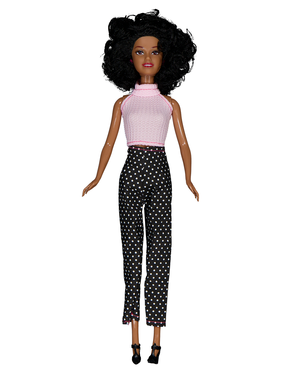 Deze speelgoedpop heeft zwart haar en draagt een roze top met een zwarte broek met witte stippen. De pop is 31 centimeter hoog en 12 centimeter breed. Door het lichte gewicht van 142 gram neem je haar gemakkelijk mee.