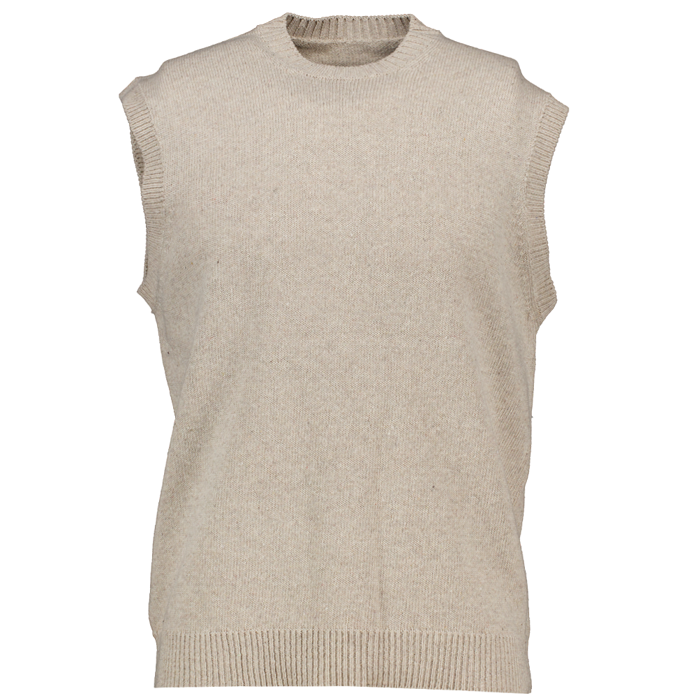 Deze fijngebreide spencer in een zandkleur heeft een rechte pasvorm en een ronde hals met ribboord. De spencer is gemaakt met verschillende gerecyclede materialen, waaronder acryl, viscose en katoen. Draag de spencer over een overhemd of T-shirt. Ook verkrijgbaar in antraciet.