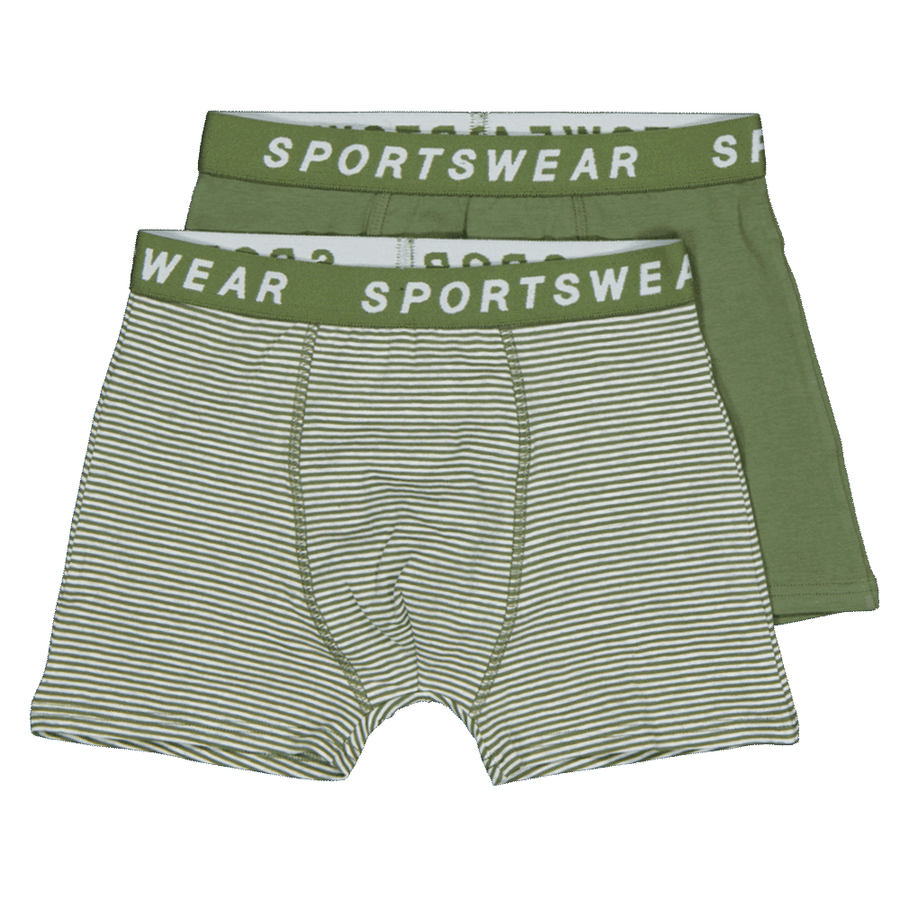 Deze set van 2 Sportswear boxers voor jongens bestaat uit één effen groene boxer en één met groen-witte strepen. De brede, elastische tailleband zorgt ervoor dat de boxers goed blijven zitten tijdens het bewegen. Het zachte katoen met een beetje elastaan geeft een prettig draagcomfort en sluit mooi aan op de huid.
