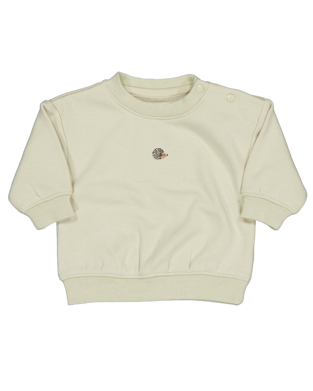 Deze beige sweater voor baby's heeft een ronde hals en zachte, superzachte binnenkant. Op de borst staat een klein diermotief. De trui heeft lange mouwen, een comfortabele boord aan de onderkant en bij de mouwen, en een drukknoopje op de schouder voor makkelijk aan- en uittrekken. Ideaal voor extra warmte en comfort op frissere dagen.
