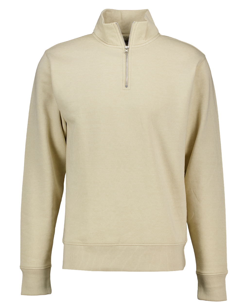 Deze beige sweater voor heren is gemaakt van een zachte gebreide fleece van polyester en katoen. De hoge kraag met korte rits maakt het makkelijk om zelf de warmte te regelen. Dankzij de aansluitende boorden blijft de trui goed zitten. Door de effen kleur is deze sweater eenvoudig te combineren met andere kledingstukken.