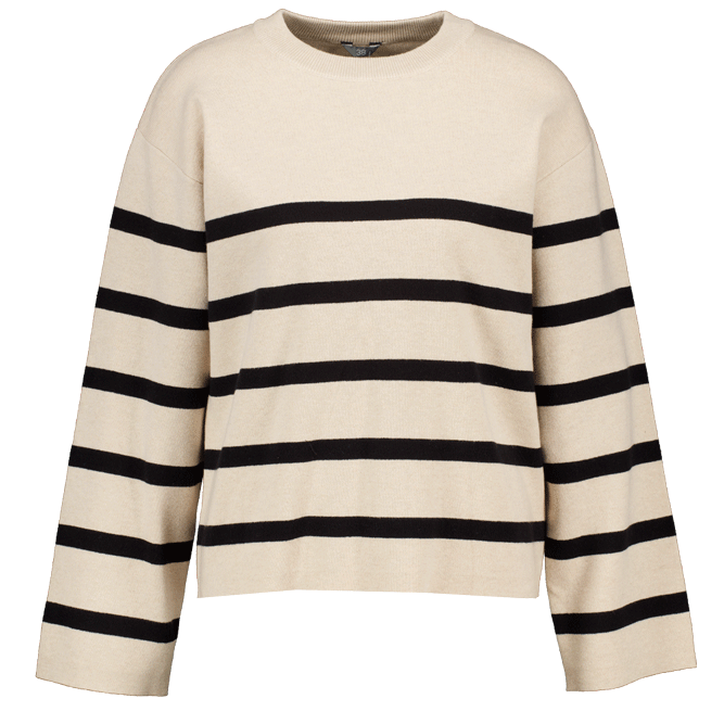 Deze witte trui voor dames heeft een frisse uitstraling met zwarte strepen. Gemaakt van 70% katoen en 30% polyamide, biedt het een zacht en comfortabel gevoel. De ronde hals en de losse pasvorm zorgen voor een relaxte fit. Ideaal voor een casual look in je vrije tijd.