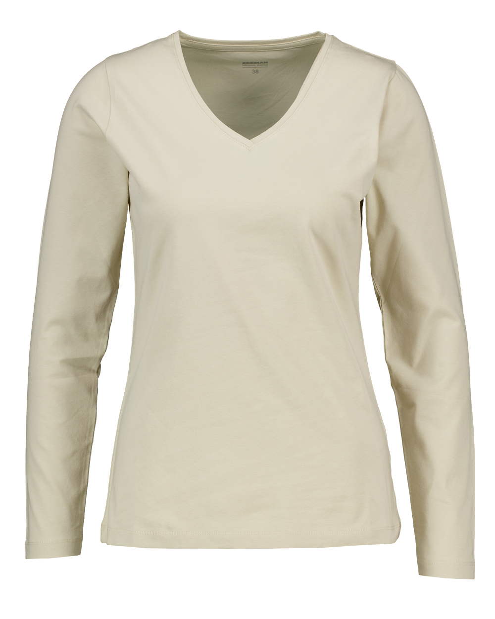 Deze dames T-shirt heeft lange mouwen en een V-hals. De stof voelt soepel aan en is gemaakt van een mix van katoen, gerecycled katoen en elastaan, wat zorgt voor draagcomfort en een lichte stretch. Door het eenvoudige ontwerp zonder opdruk of opvallende details is dit shirt geschikt om los te dragen of onder een vest of trui.
