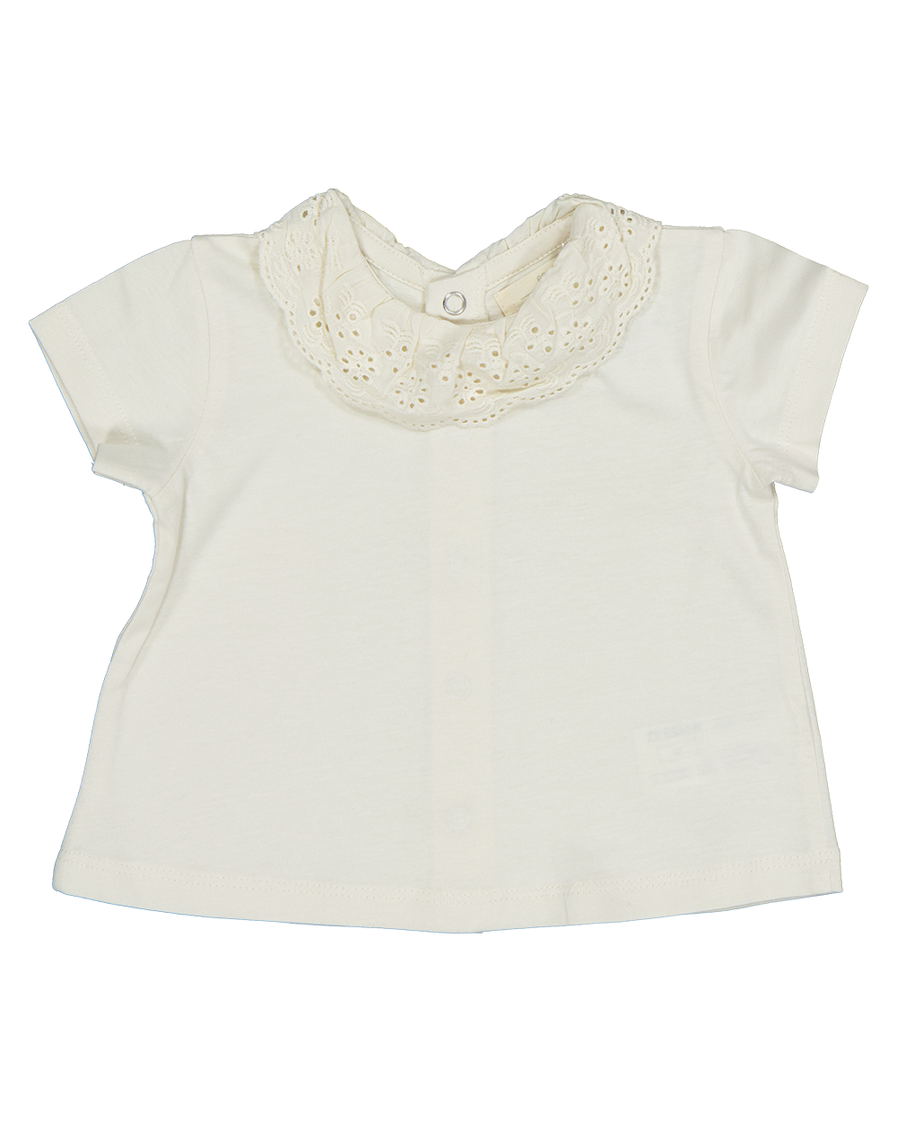 Dit T-shirt voor meisjes is gemaakt van 100% katoen, wat zorgt voor een zachte en ademende kwaliteit. Het heeft een ronde hals met een schattige ruffle en een drukknop sluiting aan de achterkant voor eenvoudig aankleden. Verkrijgbaar in de kleur wit, ideaal voor elke kindergarderobe.