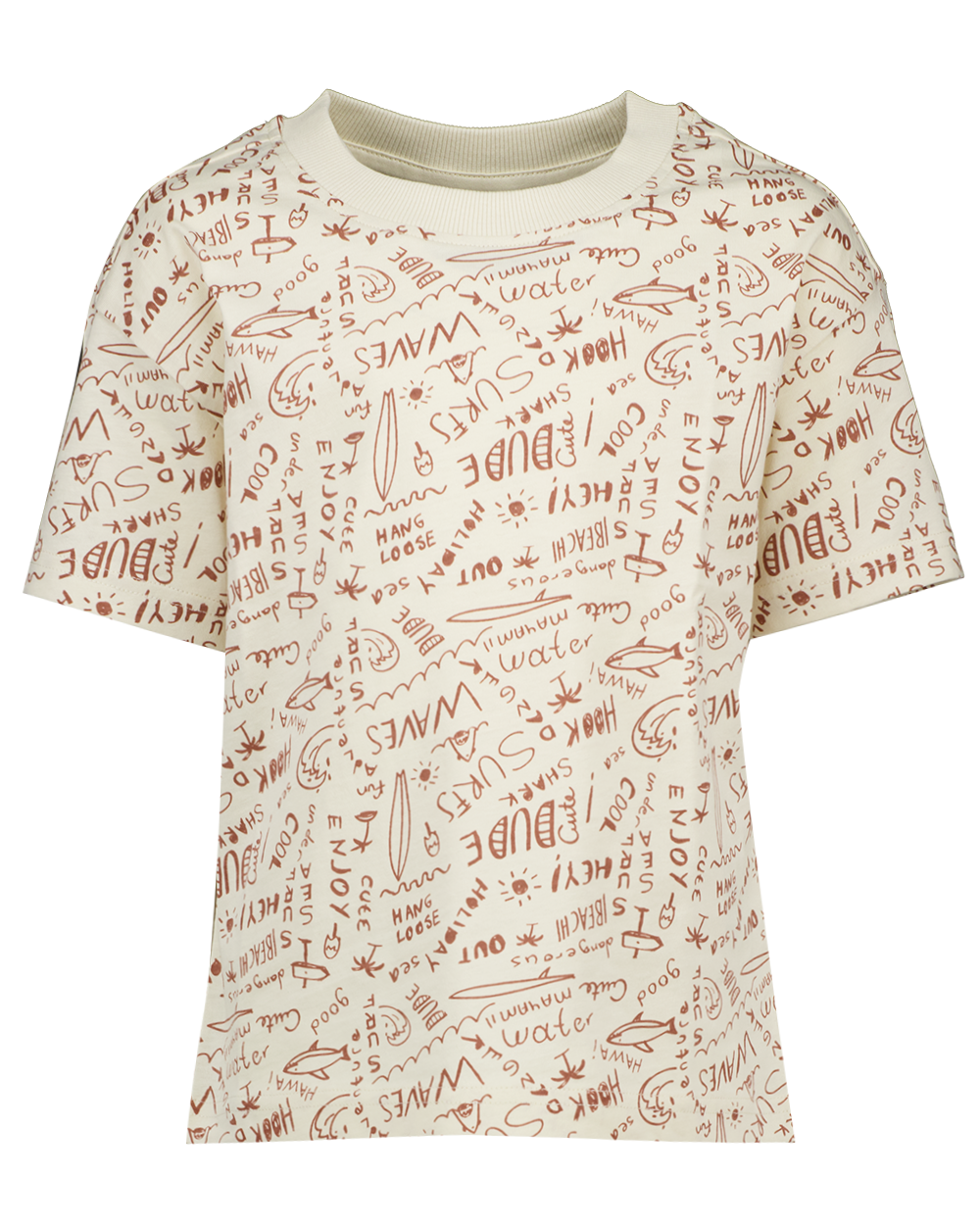 Deze beige T-shirt is gemaakt van 100% katoen en voelt daardoor zacht aan op de huid. Het shirt heeft een ronde hals en korte mouwen. Op het hele oppervlak staan diverse teksten en grafische elementen in roodbruin, wat zorgt voor een speelse uitstraling. Door de katoenen stof is het ademend en prettig om te dragen op warme dagen.