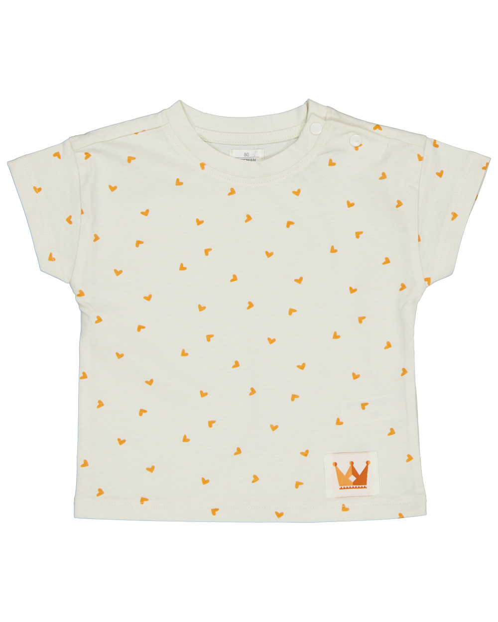 Dit uniseks baby T-shirt is gemaakt van 100% katoen, wat zorgt voor een zwaar, comfortabel gevoel. Het T-shirt heeft een leuke all-over print met kleine hartjes in een warme kleur. Met de drukknoopjes aan de schouder is het makkelijk aan en uit te trekken. Ideaal voor elke dag.