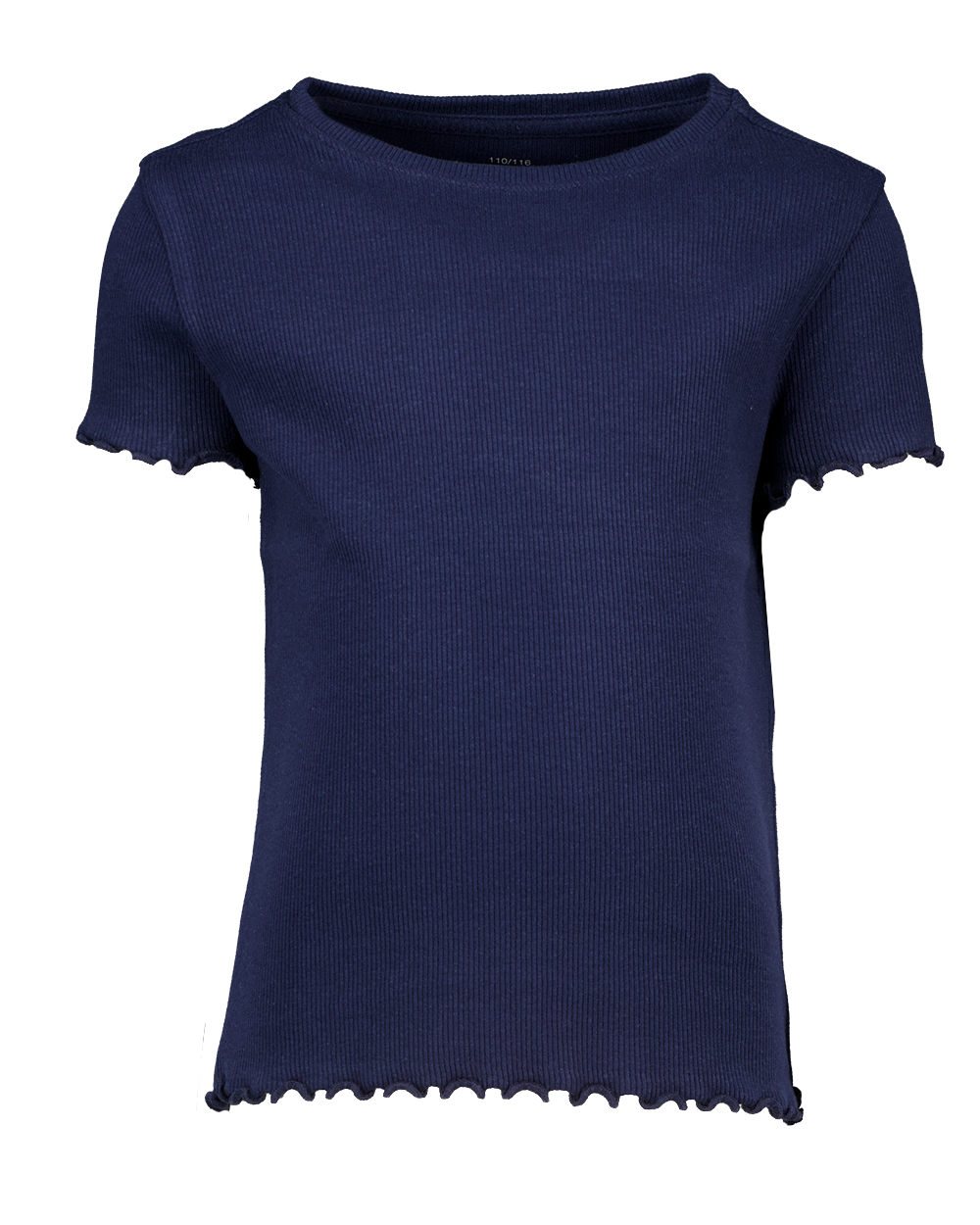 Dit blauwe T-shirt voor meisjes heeft korte mouwen en een lichte stretch door de samenstelling van katoen en elasthaan. De ribstructuur zorgt voor een comfortabele pasvorm en het shirt heeft een eenvoudige, tijdloze uitstraling.