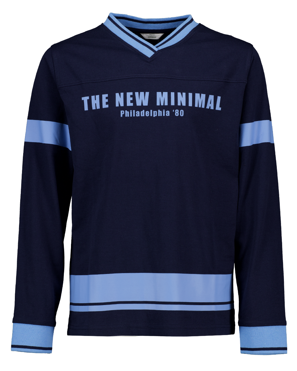 Deze blauwe jongens T-shirt heeft lange mouwen en een opvallende opdruk met de tekst 'The New Minimal Philadelphia '89' op de borst. De stof bestaat uit een mix van katoen en polyester, wat zorgt voor draagcomfort. De V-hals en boorden zijn afgewerkt met contrasterende lichtblauwe strepen. Ideaal voor een sportieve en moderne uitstraling.