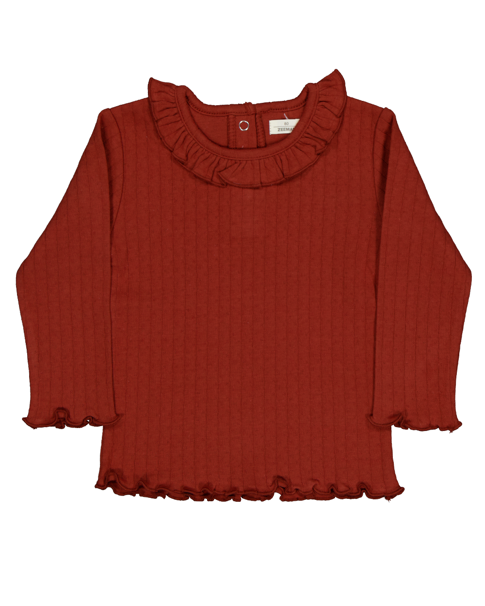 Dit bruine T-shirt voor baby’s heeft lange mouwen en een gerimpelde hals. Het is gemaakt van 100% katoen, wat zorgt voor een zachte en comfortabele draagervaring. De geribbelde stof maakt het shirt luchtig en flexibel bij het bewegen.