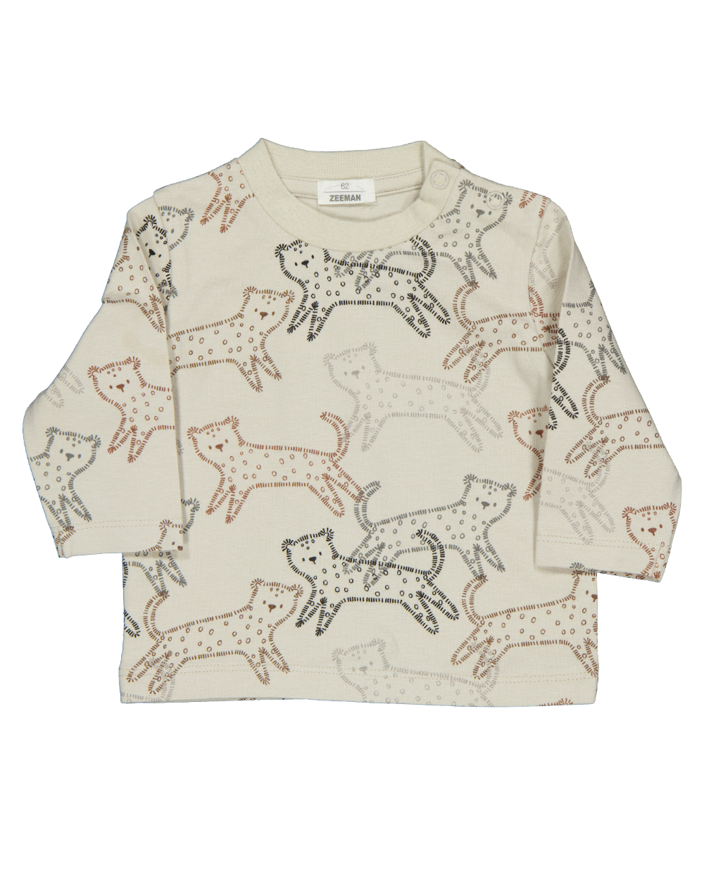 Deze grijze baby T-shirt heeft een speelse all-over print van getekende dieren, wat zorgt voor een vrolijke uitstraling. De lange mouwen maken het geschikt voor koelere dagen en bieden extra warmte. De hals is afgewerkt met een eenvoudige boord, wat het aan- en uittrekken makkelijk maakt. Ideaal voor baby's die comfortabel willen bewegen en er toch leuk uitzien.