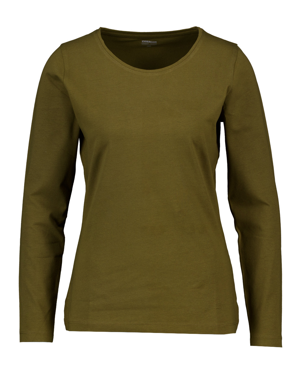 Deze groene dames T-shirt heeft lange mouwen en een ronde hals. De stof bestaat uit een mix van katoen, gerecycled katoen en elastaan, wat zorgt voor een zachte en comfortabele pasvorm. Het materiaal is single jersey, waardoor het soepel valt. Er zijn geen zichtbare patronen, knopen of opdrukken aanwezig. Ideaal voor een eenvoudige en praktische outfit.