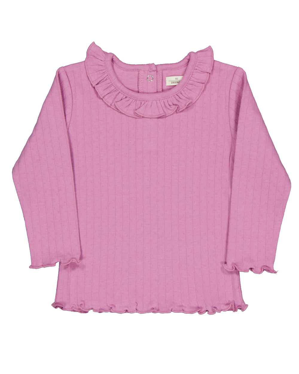 Deze paarse T-shirt voor baby’s heeft lange mouwen en een gerimpelde kraag. De stof bestaat volledig uit katoen, wat zorgt voor een zachte en ademende kwaliteit. De ribstructuur geeft het kledingstuk een eenvoudig maar duidelijk patroon.