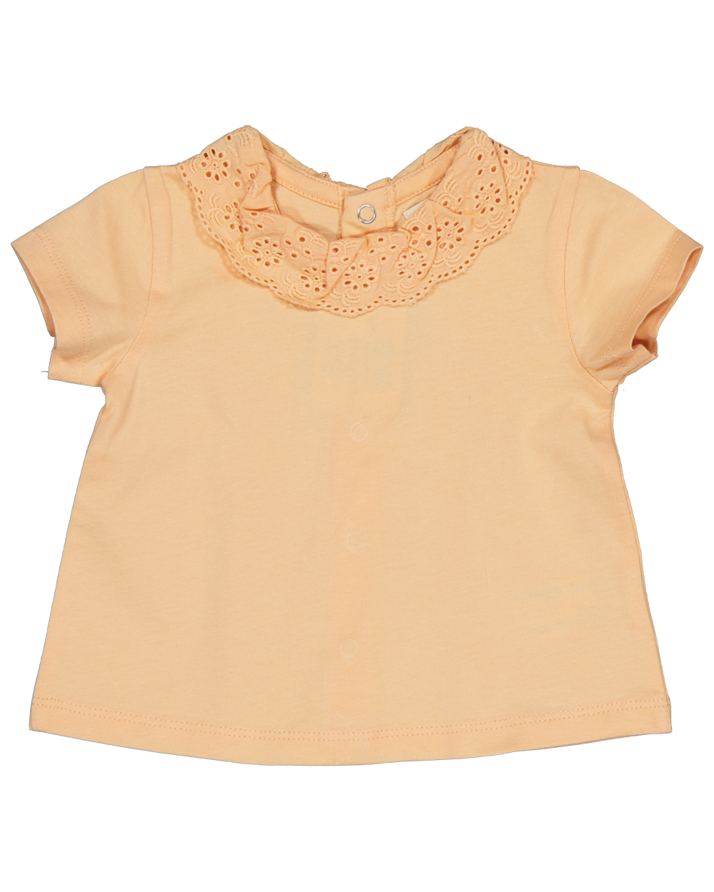 Dit T-shirt voor meisjes is gemaakt van 100% katoen, wat zorgt voor een zachte en comfortabele feel. De lichte kleur geeft het een frisse uitstraling. Het shirt heeft een ronde hals met een schattige, decoratieve rand. Het is eenvoudig te combineren met andere kledingstukken. Geschikt voor de kleinste fashionista's.