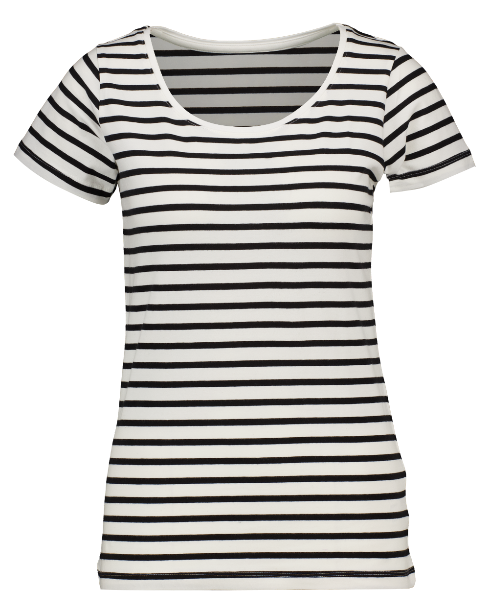 Dit dames T-shirt heeft een horizontaal gestreept patroon in wit en zwart en korte mouwen. De ronde hals en soepele stof zorgen voor een comfortabele pasvorm. Door de mix van 80% katoen, 5% elastaan en 15% gerecycled katoen beweegt het T-shirt goed met je lichaam mee. En voelt het materiaal zacht aan op de huid.