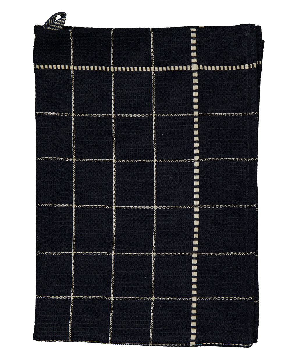 Deze theedoek heeft een zwart ruitpatroon en is geweven. Het materiaal is 100% katoen (BCI), wat zorgt voor een goede vochtopname. Met een afmeting van 50 bij 70 centimeter is deze theedoek handig in gebruik en heeft een kleine lus om op te hangen.
