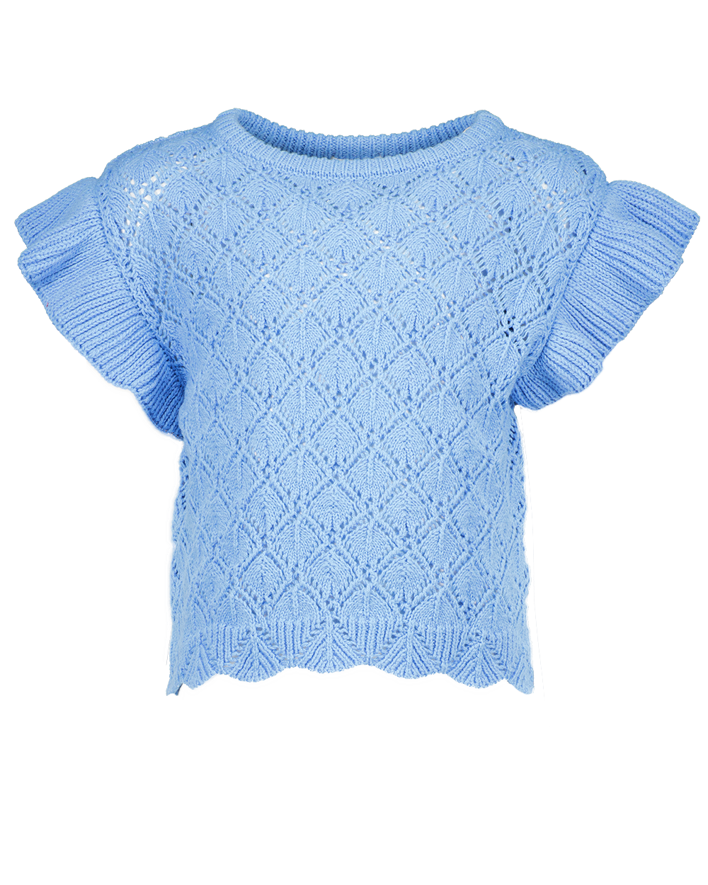 Deze blauwe top is gemaakt van een mix van katoen en acryl. De stof heeft een opengewerkt patroon en voelt licht aan. De korte mouwen zijn voorzien van opvallende ruches. De hals en onderkant zijn netjes afgewerkt met een golvende rand. Dankzij het luchtige materiaal is deze top prettig om te dragen op warme dagen.