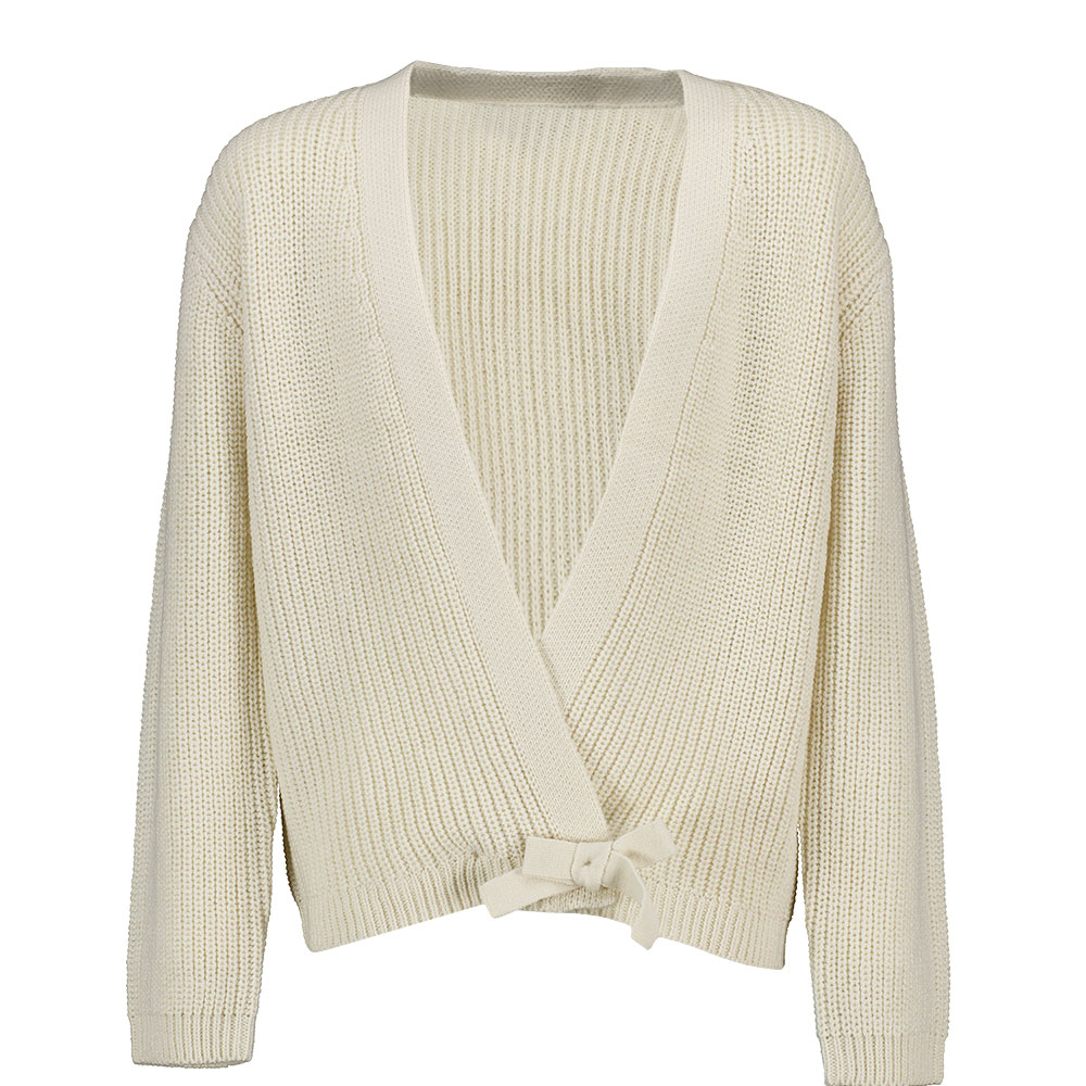 Deze witte cardigan voor meisjes is gemaakt van 100% acryl en heeft een ontspannen pasvorm. Het heeft een V-hals en een stijlvolle strik aan de voorkant. De ribbelstructuur geeft extra detail. Ideaal om over een T-shirt of jurk te dragen, voor een gezellige look in elke situatie.